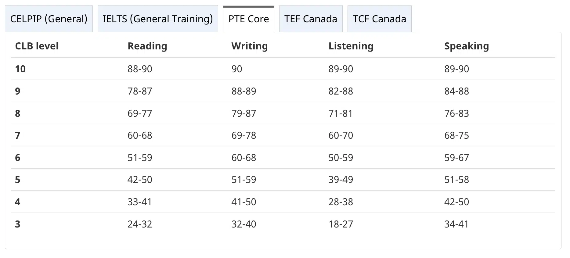 Dưới đây là bảng quy đổi điểm giữa kỳ thi PTE Core và Canadian Language Benchmark (CLB).