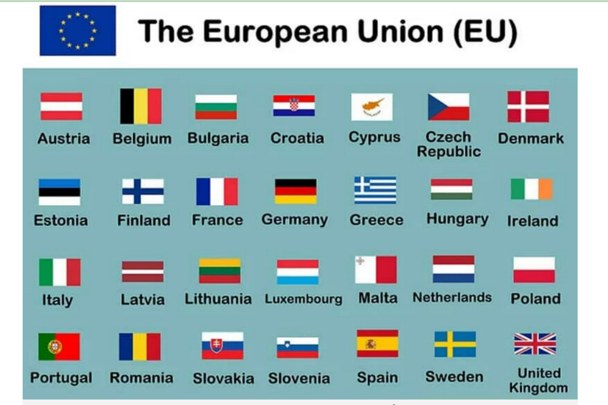 Liên minh châu Âu EU được thành lập vào năm 1993 với 27 quốc gia thành viên (tính tới năm 2020) bao gồm: Pháp, Đức, Bulgaria, Cộng hòa Séc, Áo, Bỉ, Phần Lan, Tây Ban Nha, Đan Mạch, Síp, Hy Lạp, Bồ Đào Nha, Latvia, Malta, Ba Lan, Hà Lan, Litva, Italia, Thụy Điển, Slovakia, Estonia, Hungary, Rumani, Ireland, Slovenia, Croatia, Cộng Hòa Síp.